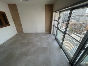 その後、明るさと高級感を兼ね備えた石目調の床材を施工いたしました。落ち着いたグレートーンを採用することで、室内に上品で洗練された印象をもたらし、自然光との相性も良く、光をやわらかく反射する空間へと仕上げています。