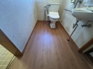 現地調査では、床材全体に経年劣化による剥離や摩耗が確認され、部分的な補修では対応が難しい状態であると判断いたしました。また、水回りであるトイレは湿気や汚れが蓄積しやすく、既存の床材のままでは今後も劣化が進行する可能性が高い状況でした。